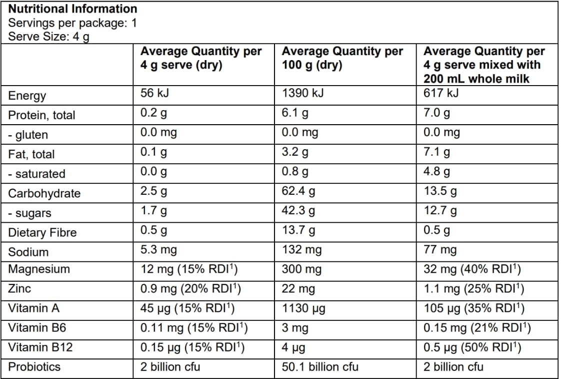 Strawberry (30%*), Banana, Monk Fruit Juice, Natural Strawberry Flavour, Mango, Beetroot, Probiotic Blend (Lactobacillus acidophilus, Bifidobacterium lactis, Bifidobacterium bifidum, Bifidobacterium longum), Raspberry, Pear, DHA (Fish Oil), Magnesium, Anticaking Agent (Silicon Dioxide), Broccoli Sprout, Blueberry, Carrot, Stabiliser (Xanthan Gum), Spinach, Kale, Elderberry Extract, Turmeric, Kakadu Plum, Zinc, Ginger Extract, Beta Carotene, Vitamin B6, Vitamin B12.