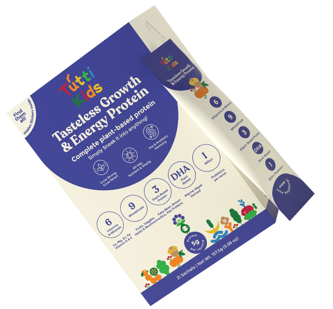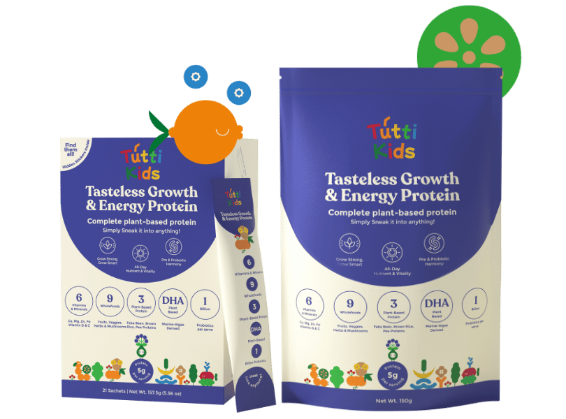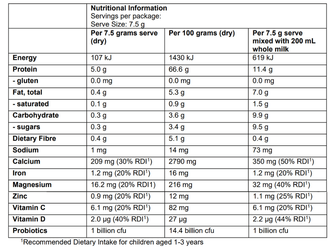 Proteins (77%*) (Faba Bean, Brown Rice, Pumpkin Seed), Minerals (Calcium Citrate, Magnesium Citrate, Zinc Gluconate, Ferrous Fumarate (Iron)), Prebiotic Fibre (Inulin, Green Banana Starch), Stabiliser (Xanthan Gum), Probiotic Blend (Lactobacillus acidophilus, Bifidobacterium lactis, Bifidobacterium bifidum, Bifidobacterium longum), Fruits and Vegetables (Apple, Banana, Broccoli, Carrot, Kakadu Plum, Pear, Spinach), Elderberry Extract, Marine-Algae Docosahexaenoic Acid (DHA), Vitamin C, Maitake Mushroom Extract, Vitamin D.